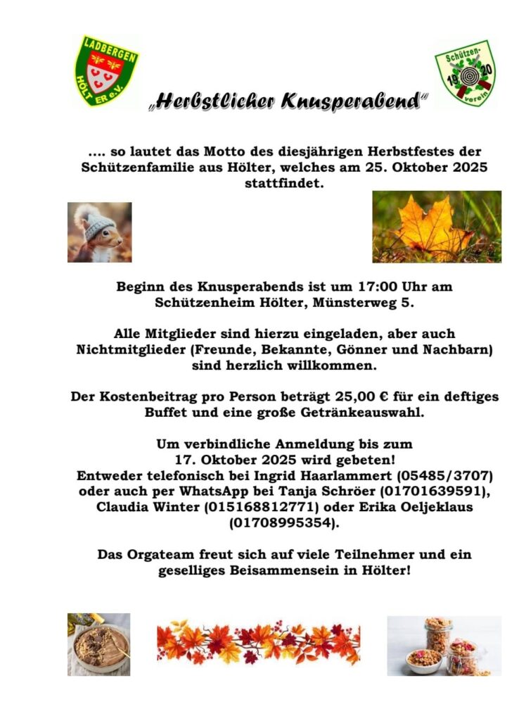 “Herbstlicher Knusperabend” … so lautet das Motto des diesjährigen Herbstfestes der Schützenfamilie aus Hölter, welches am 25. Oktober 2025 stattfindet.