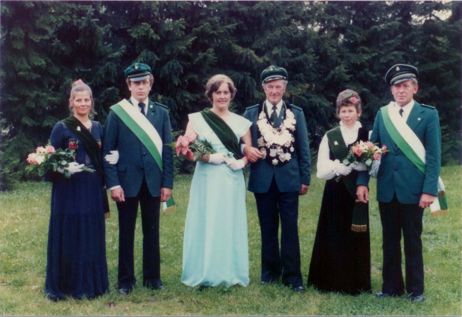 Königspaar mit Hofstaat, vlnr: Wolf Hoffschulte mit Gattin, Margret und Franz Meyer (Königspaar 1977), Ria und Erich Kattmann, Meta und Adolf Haarlammert
