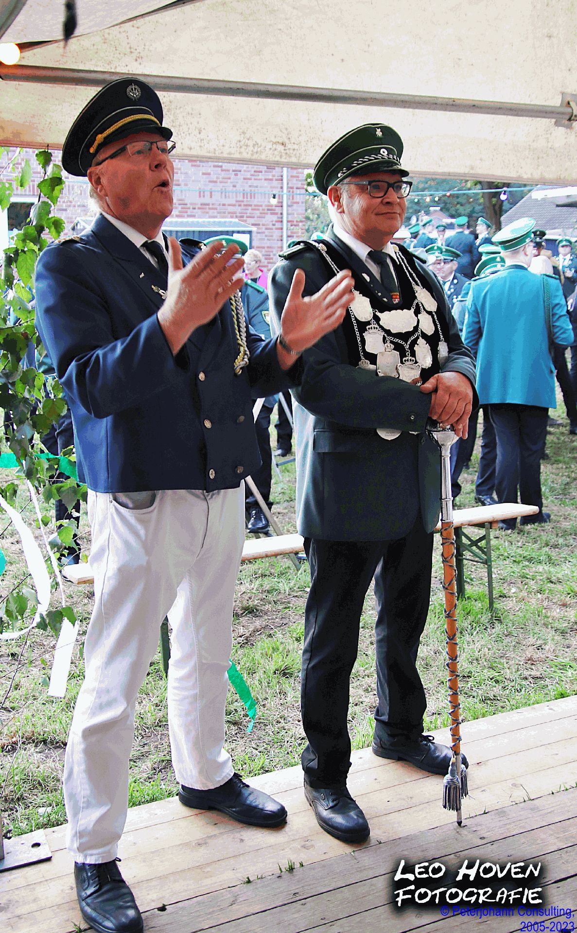 Auf dem Fest­platz wur­den die Schützen von zahlre­ichen Gästen erwartet. Nach harten “Ver­hand­lun­gen” trat Wolf­gang Griestop die Nach­folge von André Leise sowie Finn Holthaus die Nach­folge von Leonie Falke­nau an. Beim Fes­t­ball spielte “DJ Walky” und die Schützen­fam­i­lie feierte bis spät in die Nacht.